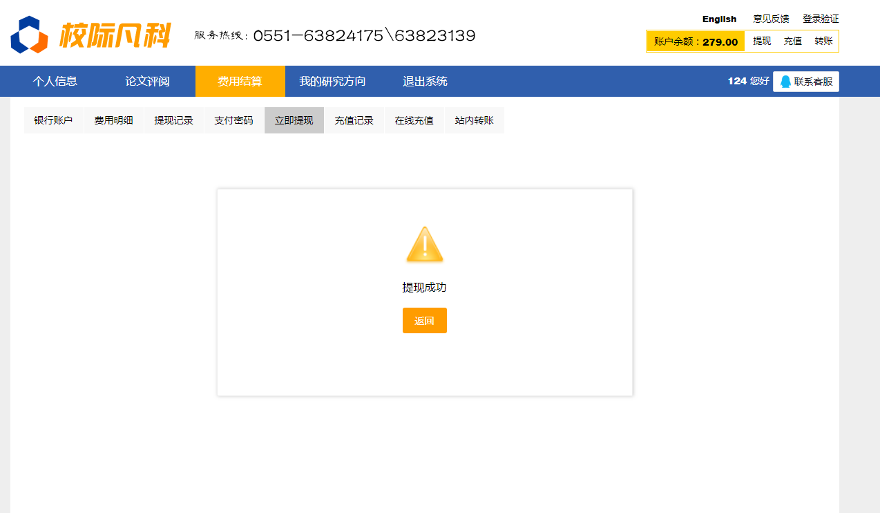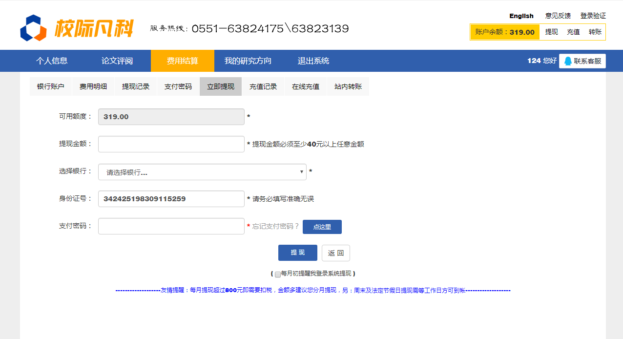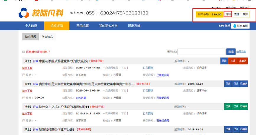如果結(jié)算方式是線下結(jié)算或是校內(nèi)送審的,請聯(lián)系學校秘書或是分給您論文的老師。 結(jié)算方式是“在線結(jié)算”的。您點“最終定稿”后,刷新平臺,您的賬戶余額會自動增加本篇論文的評審費。可在線提現(xiàn)(綁定銀行卡,設(shè)置支付密碼, <此處的支付密碼并不是您的銀<>行卡密碼,是您用于平臺提現(xiàn)設(shè)的密碼。用于后期提現(xiàn)用> );