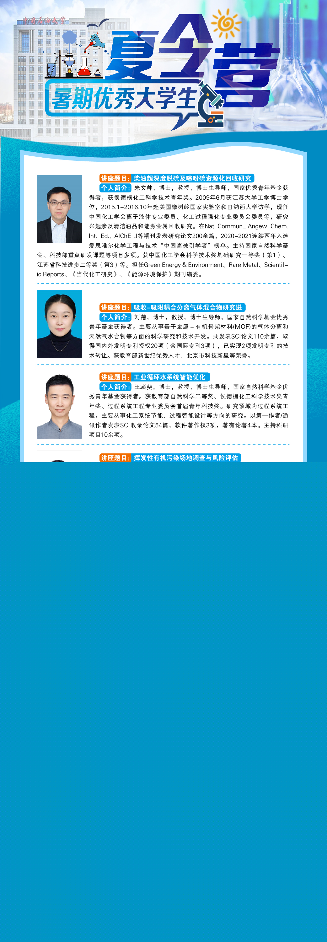 為了促進(jìn)全國(guó)高校化學(xué)、化工、環(huán)境相關(guān)專業(yè)優(yōu)秀本科生更好地了解中國(guó)石油大學(xué)(北京)化學(xué)工程與環(huán)境學(xué)院,推進(jìn)有意深造讀研學(xué)生與知名教授之間交流,學(xué)院將于2022年7月16至7月17日、8月13至8月14日分別舉辦兩期優(yōu)秀大學(xué)生暑期夏令營(yíng)活動(dòng)。此次夏令營(yíng)將通過騰訊會(huì)議線上進(jìn)行交流、學(xué)習(xí)、培訓(xùn)。