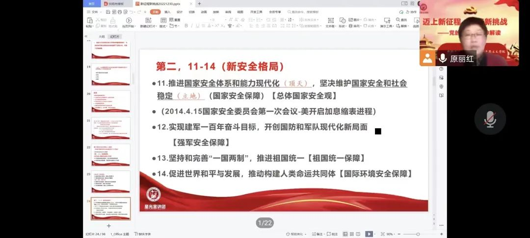 舉辦宣講活動深入學。學院各基層黨團組織結合實際開展宣講活動,掀起黨的二十大精神學習熱潮。學院邀請中國石油大學(華東)馬克思主義學院副教授、中國化馬克思主義研究中心副主任原麗紅作了題為“邁上新征程,迎接新挑戰——黨的二十大精神解讀”的專題報告,結合重大歷史事件,深入剖析了黨的二十大報告的關鍵內容,全面解讀了黨的二十大會議精神。各黨團支部結合支部實際,邀請學校二十大精神宣講團成員開展精神宣講,系統梳理黨的二十大精神內涵,深化會議精神學習。