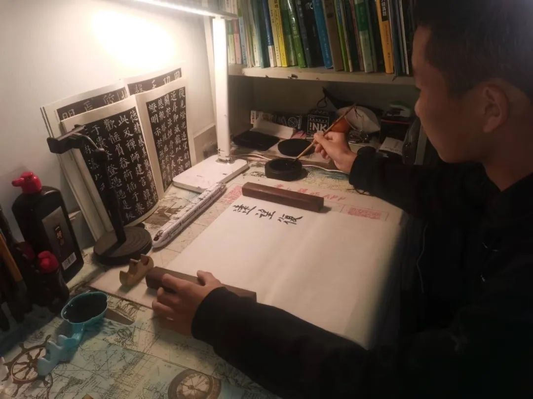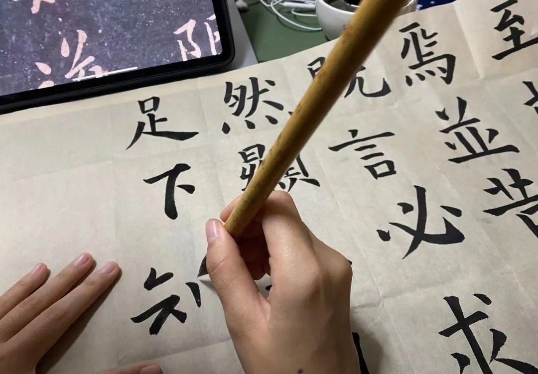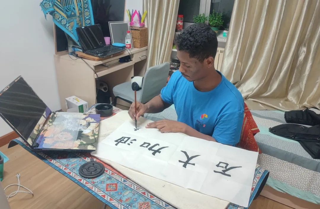 拿出我最喜歡的筆墨紙硯,靜心、凝神,思考、沉淀,還有留學生們也用毛筆字為“中石大加油!”