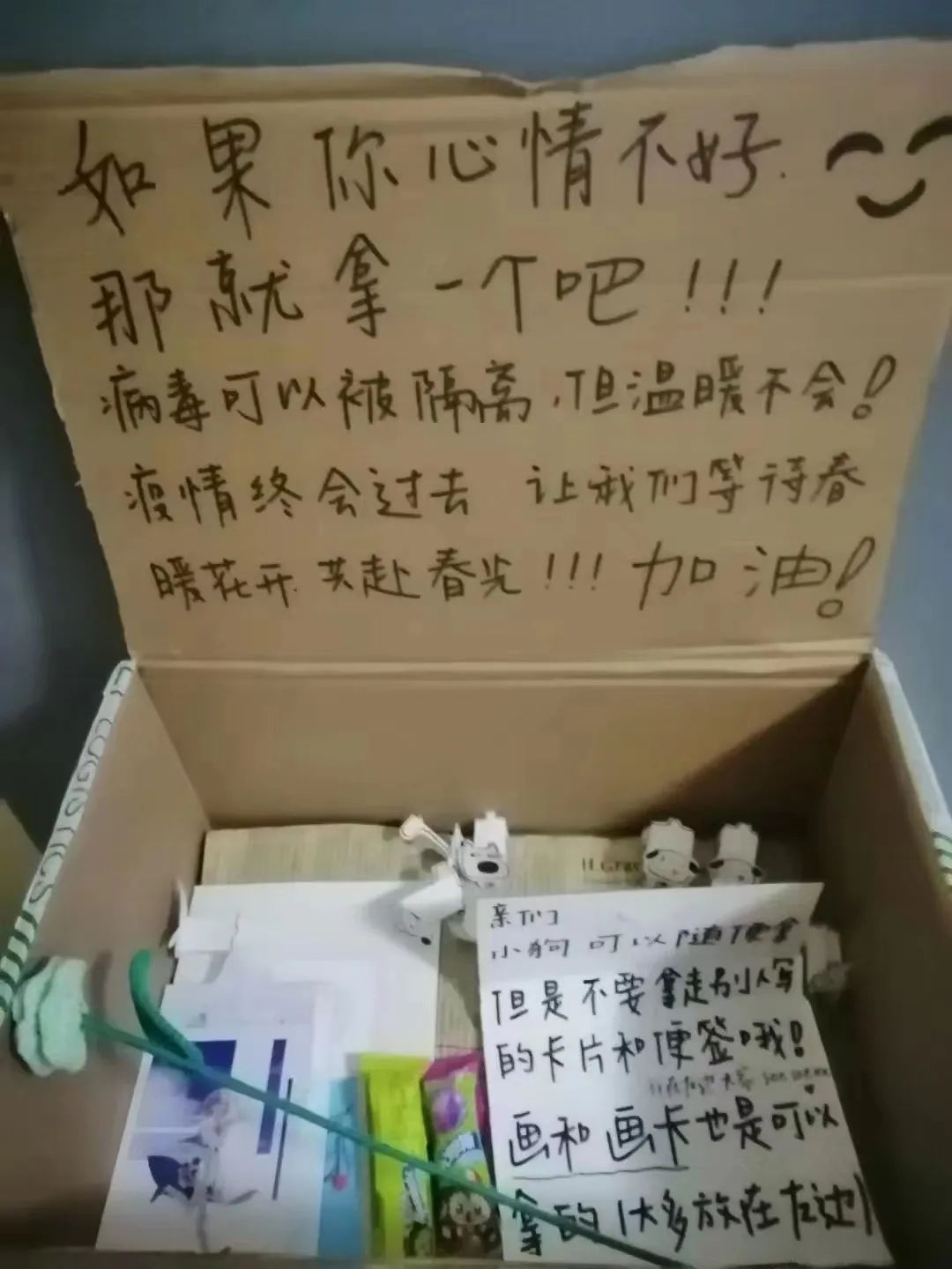 王天陽說,自己也是受另一位小姐姐的啟發,才想到用愛心盒子的方式給大家打氣,“病毒可以被隔離,但溫暖不會!”