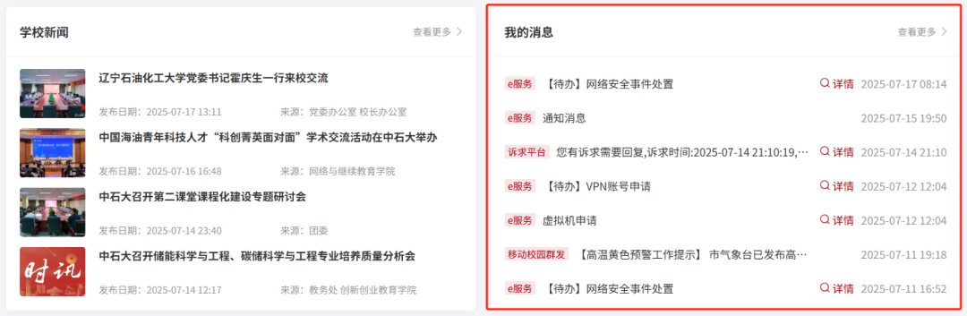 新版融合門戶堅(jiān)守融合、智能、便捷、高效理念,以簡(jiǎn)潔、干凈、美觀、大方為視覺(jué)錨點(diǎn)。頂部紅色欄搭配?;眨瑐鬟f校園文化底蘊(yùn),構(gòu)建品牌識(shí)別記憶點(diǎn)。搜索欄醒目布局,功能入口整齊排列,數(shù)據(jù)看板、應(yīng)用系統(tǒng)等模塊有序鋪陳,信息層級(jí)清晰,既讓師生能快速捕捉關(guān)鍵內(nèi)容,又以簡(jiǎn)約美學(xué)營(yíng)造舒適直觀的交互體驗(yàn),讓實(shí)用功能與視覺(jué)享受深度融合,重塑校園數(shù)智化服務(wù)的視覺(jué)感知。