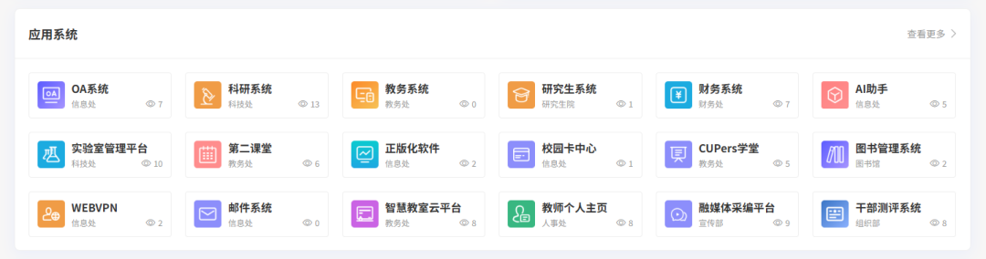 3、應(yīng)用系統(tǒng):整合校內(nèi)信息系統(tǒng)單點(diǎn)登錄入口,實(shí)現(xiàn)“一鍵直達(dá)”高效操作。