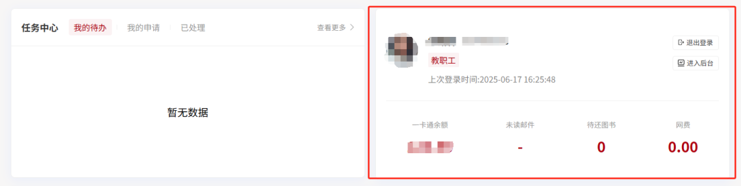 4、個(gè)人數(shù)據(jù)看板:實(shí)時(shí)顯示人臉照片、工號(hào)、一卡通余額、未讀郵件、待還圖書、網(wǎng)費(fèi)等信息,點(diǎn)擊數(shù)據(jù)直達(dá)對(duì)應(yīng)系統(tǒng)。